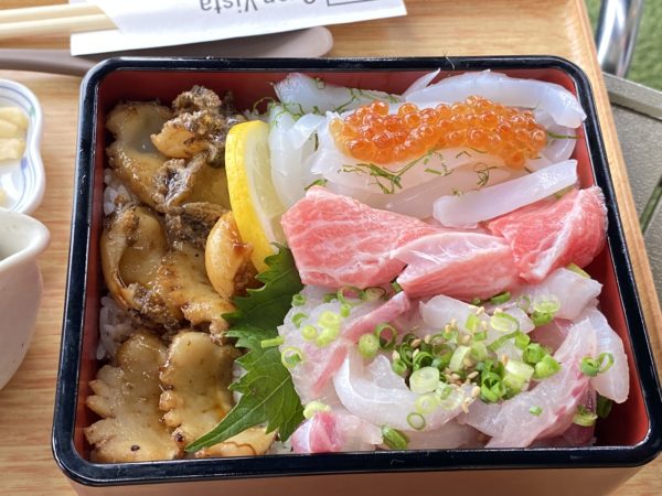 名前を忘れてしまいましたが海の宝石箱と言わんばかりの豪華なお重!あわび、イカ、大トロ、地魚数種類が入りめちゃくちゃ豪華。あわびを一口もらいましたが柔らかく肝バターの味付けが絶妙で絶品でした。