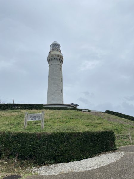 続いて車で数分の角島灯台にやってきました。写真だと分かり辛いですが雨が降ってきたため傘をさしながらの観光です。晴れていれば白い灯台が映えて絵になる風景なのですが、こればっかりは仕方なし。