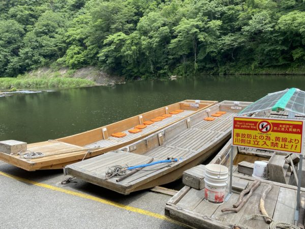 このような木舟に乗って舟下りをします。この日は乗客が多かったようでもう一回り大きな舟に乗船しました。猊鼻渓の舟下りはエンジンがなく船頭さんが木の棒で操船するタイプで往復90分のゆったりした船旅を楽しむことができます。
